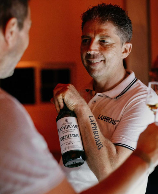 Mark Giesler führt uns durch das Tasting. Er wurde 2024 vom Whiskybotschafter als Brand Ambassador of the Year ausgezeichnet. Mark weiß einfach alles über Laphroaig und kann uns die Finessen des Whiskybrennens erklären.