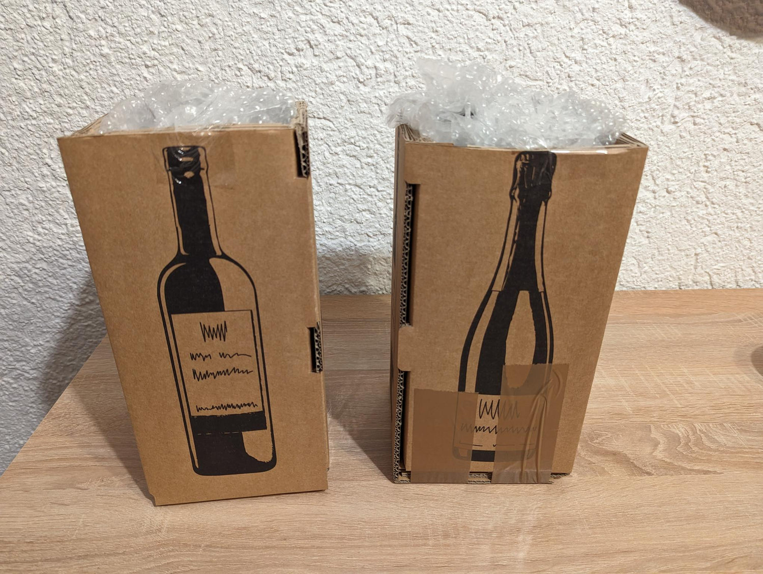 - Bei sehr zerbrechlichen Flaschen, die evtl. auch noch per Luftfracht transportiert werden, können wir auf Noppenfolie aus Plastik leider nicht verzichten. Der Schutz der Flaschen muss gewährleistet sein.