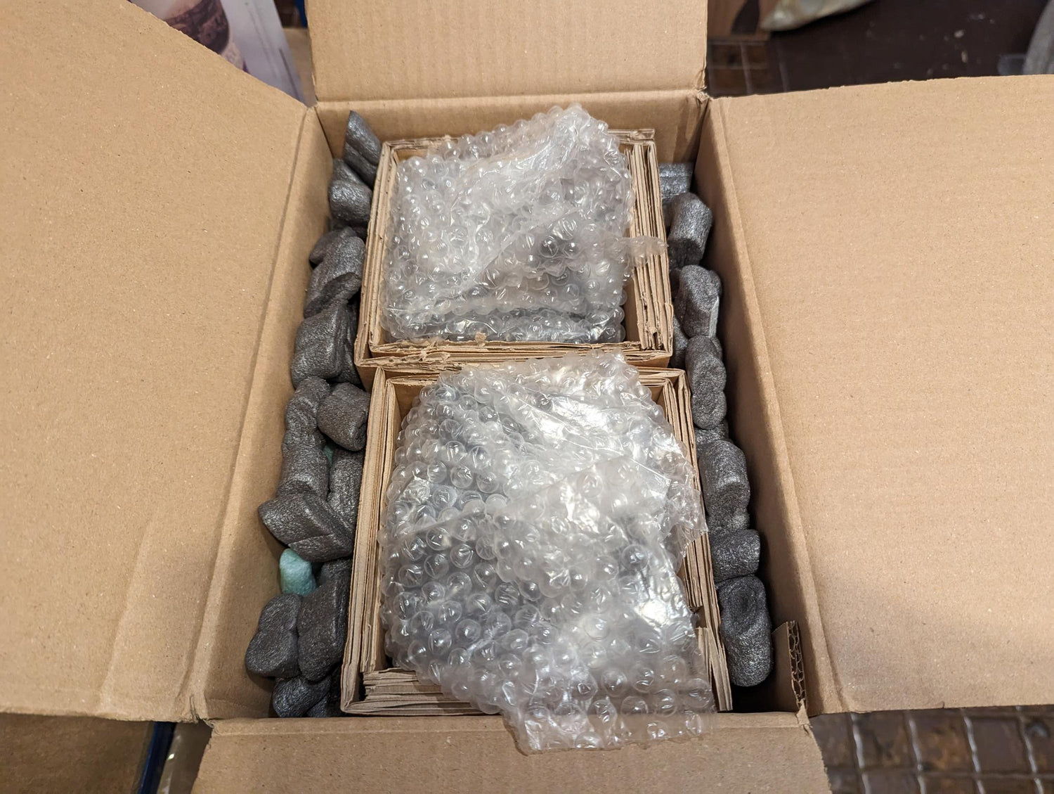 Nun werden beide Kartons in den Versandkarton gestellt und zusätzlich mit Packpapier und Verpackungschips geschützt.