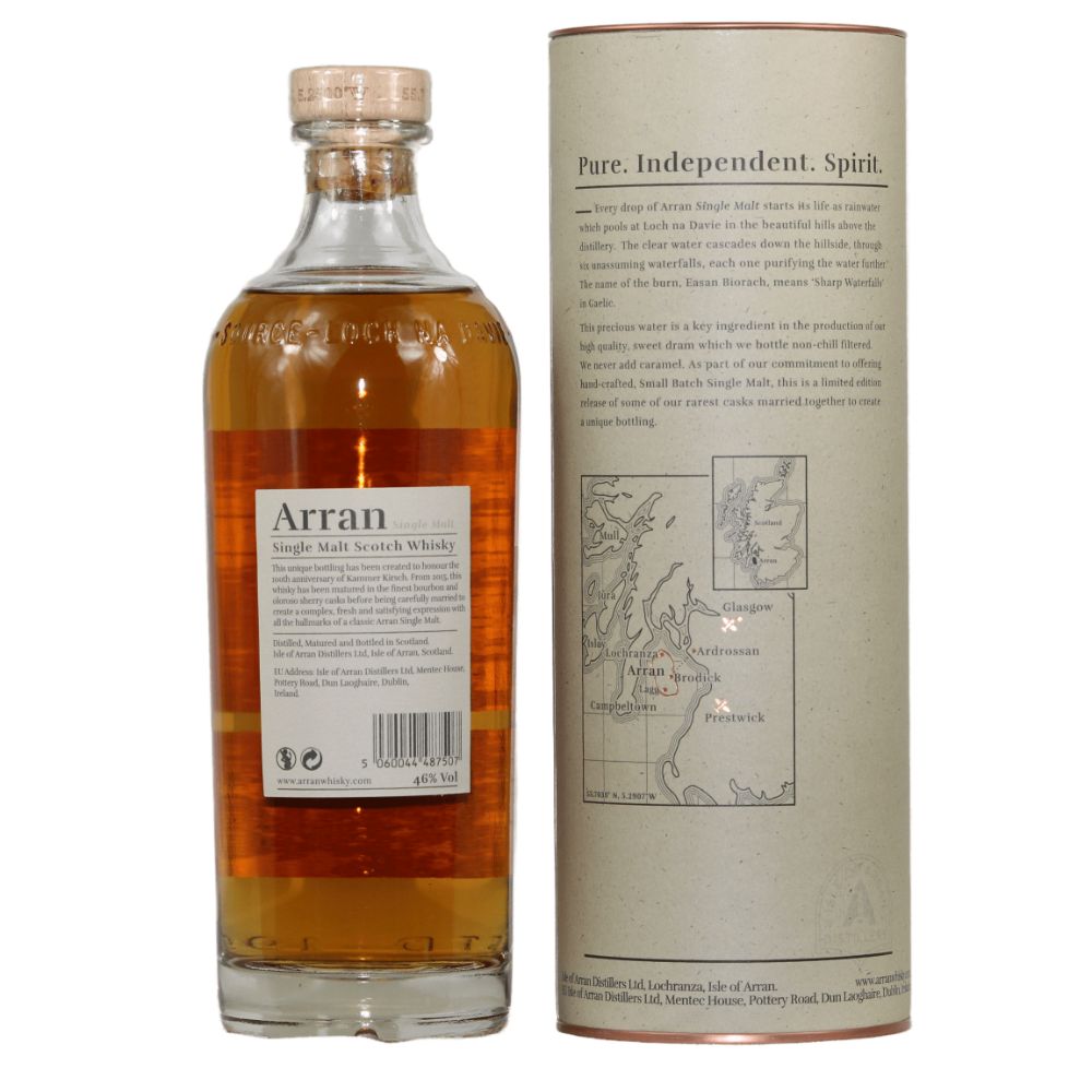 Der Arran 100th Anniversary Kammer-Kirsch ist ein außergewöhnlicher Whisky, der anlässlich des 100-jährigen Jubiläums der Kammer-Kirsch Destillerie kreiert wurde. Der Single Malt reifte seit 2015 in erstklassigen Bourbon- und Oloroso-Sherryfässern und beeindruckt mit einer Komplexität und Frische, die charakteristisch für das Arran Destillerieprofil sind.