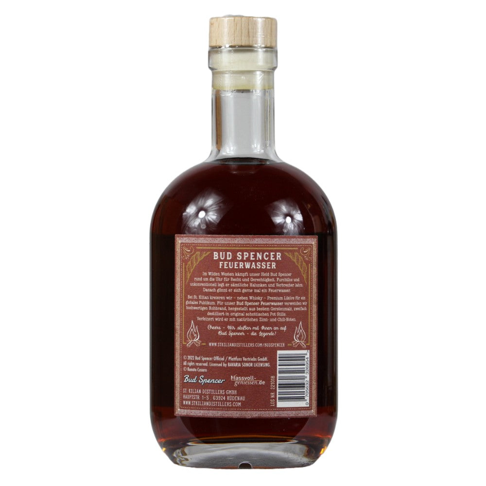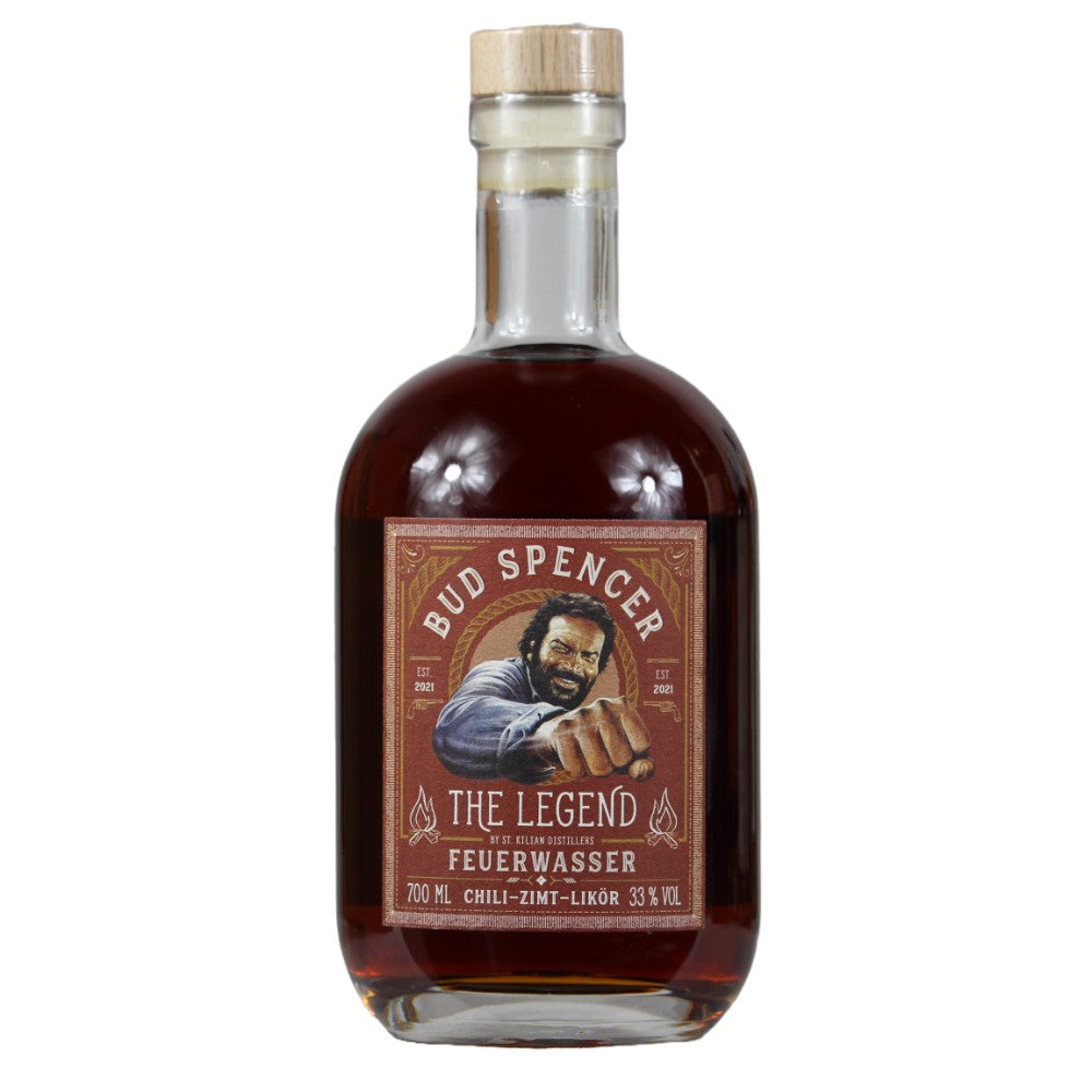 Mit Feuerwasser, einem wilden Chili-Zimt-Likör, ehrt St.Kilian den legendären Wildwest-Helden Bud Spencer, der immer für Recht und Ordnung kämpft. Hergestellt aus dem ausgezeichneten St. Kilian Single Malt Spirit, destilliert zweifach in original schottischen Pot Stills und aus feinstem Gerstenmalz, bietet das Feuerwasser ein Geschmackserlebnis, das man das ganze Jahr über genießen kann - an heißen Sommernächten oder kalten Winternächten!
