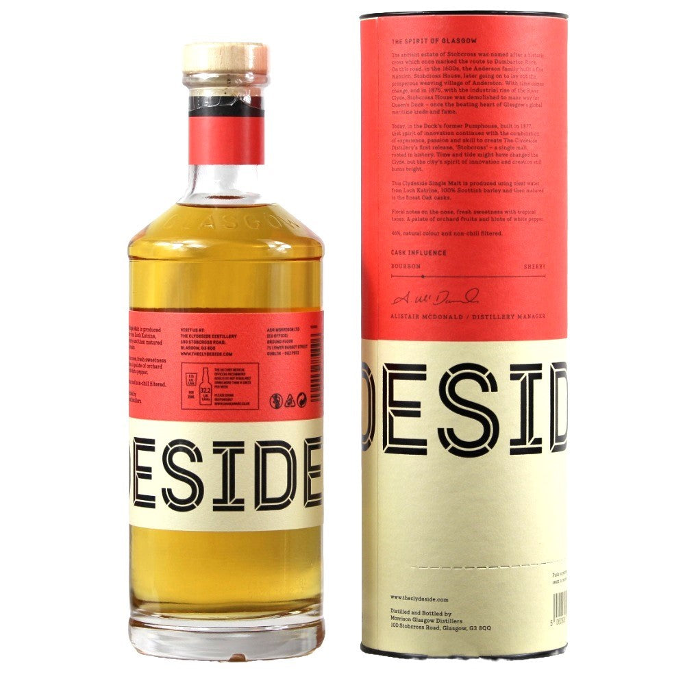Der Clydeside Stobcross Single Malt Whisky ist eine Originalabfüllung der renommierten Brennerei Clydeside, die in Schottlands Lowlands beheimatet ist. Der Whisky wird mit einem Alkoholgehalt von 46 % abgefüllt und reift in einer Kombination aus Bourbon- und Sherryfässern. Anders als bei vielen anderen Whiskys dieser Art wird bei der Herstellung des Clydeside Stobcross auf Farbstoffe und Kühlfiltrierung verzichtet, um den natürlichen Geschmack und die Aromen des Whiskys zu bewahren.