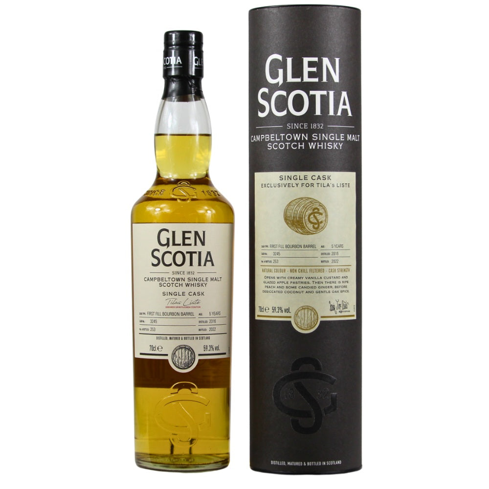 Der Glen Scotia Exclusive Cask für Tila's Liste ist ein Produkt von Glen Scotia, einer der wenigen verbliebenen unabhängigen Campbeltown Destillerien in Schottland. Die Marke ist bekannt für ihre sorgfältige Auswahl von Fässern und den Fokus auf Qualität und Exklusivität. Mit nur 253 Flaschen dieses exklusiven Whiskys verfügbar, ist es ein wahrlich einzigartiger Fund für Sammler und Whisky-Kenner.