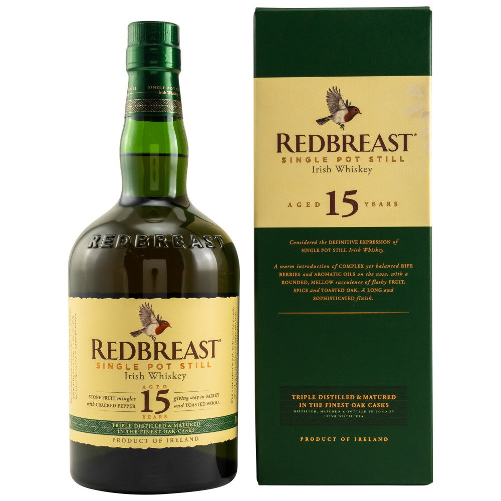 Mit einer Mischung aus gemälzter und ungemälzter Gerste, die dann in Kupferkesseln dreifach destilliert wird, besteht Redbreast 15 ausschließlich aus Pot Still Whiskys, die mindestens 15 Jahre in besten Eichenfässern gereift sind. Ein sorgfältiges Gleichgewicht zwischen Erstbefüllungs- und Nachfüllfässern unterstreicht die vielfältigen Gewürznoten im charakteristisch vollen und komplexen Geschmack von Redbreast.